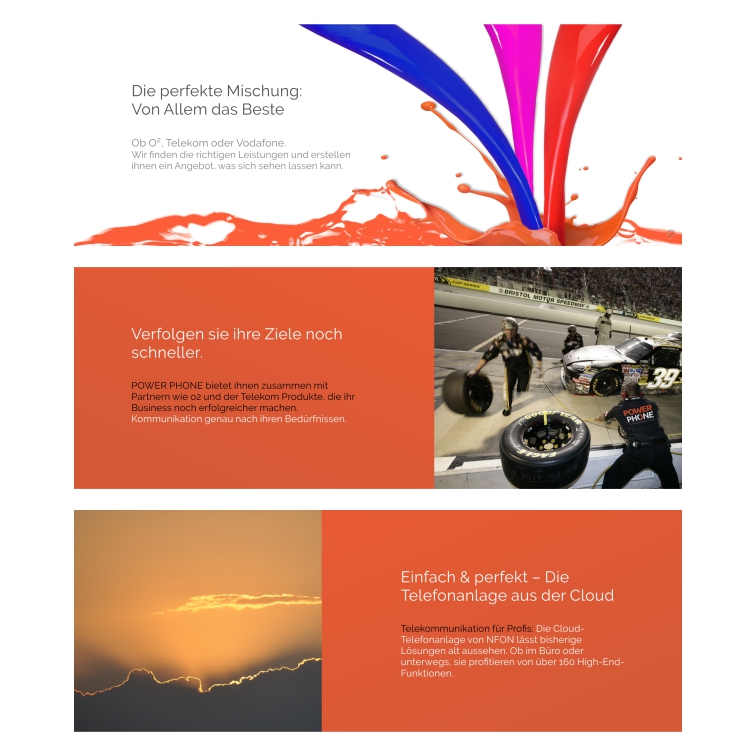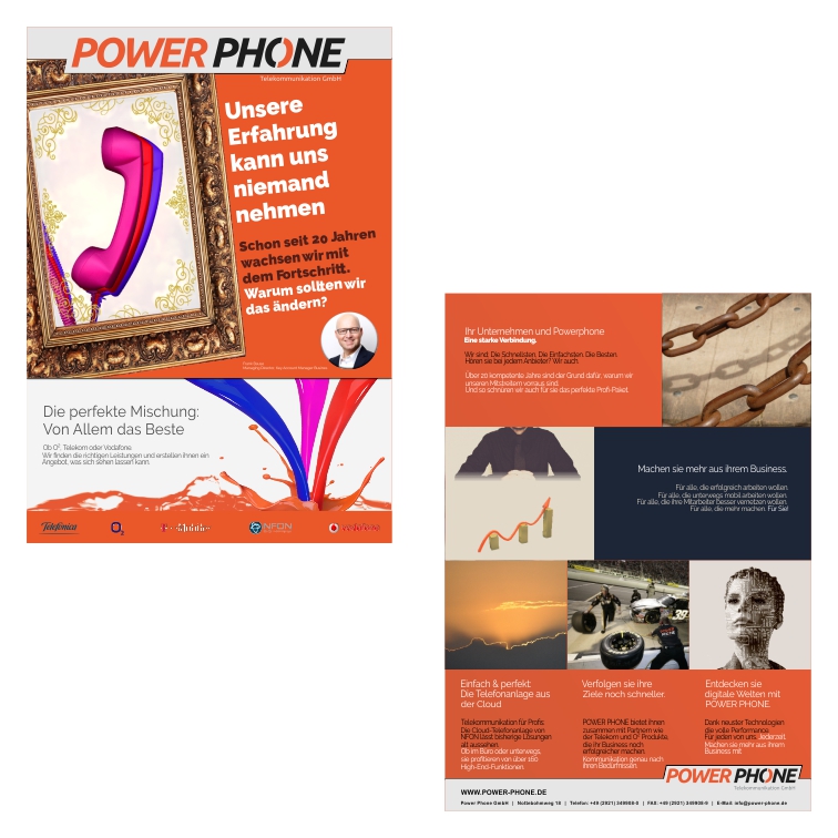 Seit 20 Jahren zelebriert Powerphone nun schon das Geschäft, mit welchem sich 2015 Jung und Alt Tag und Nacht die Zeit vertreibt: Kommunikation. So haben sie den kompletten Weg vom Akustikkoppler zum Glasfaserinternet, vom Autotelefon zur Smartwatch und vom Palm zum Tablet-Pc am eigenen Leibe erfahren. Die einstigen Technik-Fans sind mittlerweile Vollprofis und können mit geschwollener Brust von sich behaupten, dass sie den Markt kennen, wie kaum ein anderer. Diese Erfahrung geben sie gern an ihre Kunden weiter und versorgen sowohl Privat- als auch Geschäftskunden mit dem Optimum an Kompetenz. Um dieses Know How in Szene zu setzen, haben wir das Image ein wenig poliert. So gehen Slogan, Broschüre, Website-Content, Audio-Logo, Audio-Warteschleife auf unsere Kappe.